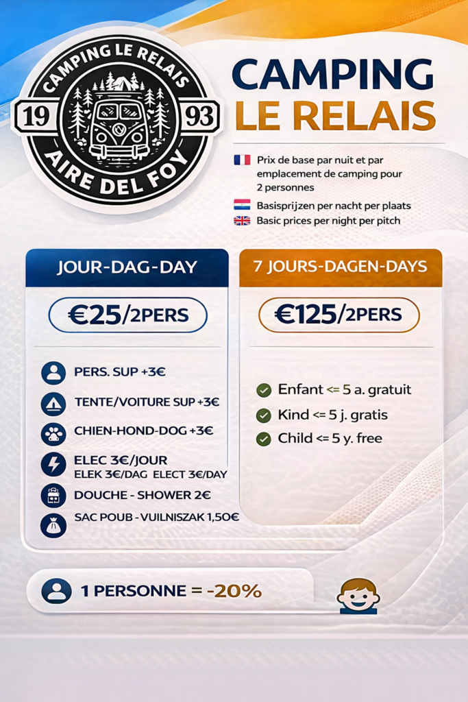 Wij zijn blij u te mogen verwelkomen op onze gezellige, familiale camping en nodigen u uit om de prachtige regio Famenne te ontdekken. Aan de poorten van de Ardennen, vlakbij de charmante stad Marche-en-Famenne (4 km), in een groene en authentieke omgeving, is dit de ideale plek voor natuurliefhebbers en wandelaars. Kom en ervaar de warme en ontspannen sfeer van onze camping, ontspan, en laat u betoveren door het park van Château de Hogne. De camping is vooral geschikt voor gezinnen met jonge kinderen, die hier rust en veiligheid vinden. Camping Le Relais beschikt over 93 volledig uitgeruste kampeerplaatsen van minimaal 120 m², op een bosrijk terrein van meer dan 12 hectare. Uw camping in de schijnwerpers van de televisie! Video 1 | Video 2 | Video 3 | Video 4 | Video 5 | Video 6 | Video 7 | Video 8